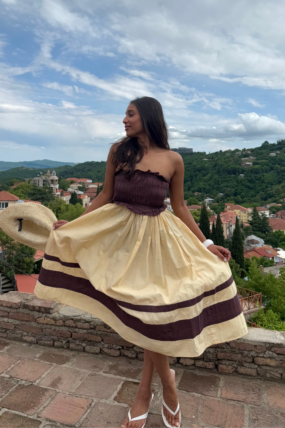 A playful shape-shifter in coco brown and sunshine yellow, Coco Bamba is a multi-functional dream. Wear it as a dress for a carefree day out or style it down as a skirt with your favourite top—either way, it’s comfort with a touch of magic. it’s made to move with you—whether you’re dancing through a festival, heading out for brunch, or chasing sunsets on vacation.